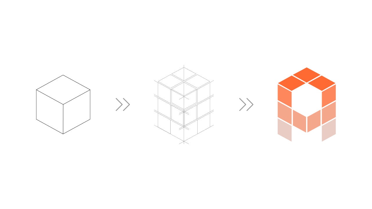 AMDlabには様々な技術を持ったメンバーが在籍しており、各々がこれまで培ってきたスキルを活かして建築業界の発展に貢献しています。 その技術のひとつひとつを立方体に見立て、それらが合わさることでひとつのシンボルとなるようロゴを構成しました。 このシンボルには様々な意味が込められており、「建築を意味するArchitectureのA」「設計される建築物(ビル)としてのモチーフ」「建築業界の発展を推進する上向の矢印のモチーフ」など、AMDlabの想いを体現するシンボルマークとなりました。 また、下から上に沿ってベージュからオレンジに変わっていくカラーは、人を笑顔にしていくという時間軸の流れを表現しています。