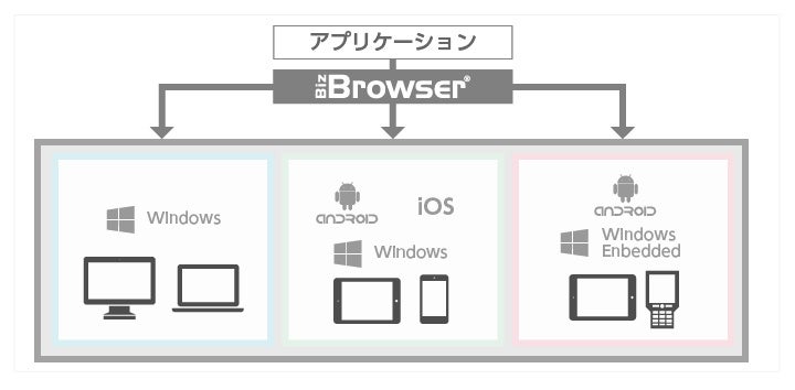 また「Biz/Browser」は様々なOSや端末に対応しており、Biz/Browserで開発したアプリケーションは、OSや端末の垣根を越えて様々な端末環境で動作させることが可能となります。加えて端末OSのアップデートや利用端末機種の変更などによるシステム動作環境の変化を吸収し、業務アプリケーションへの影響を最小化します。これにより業務システムの長期安定稼動を支え、システムの運用負荷・運用コストを大幅に削減します。