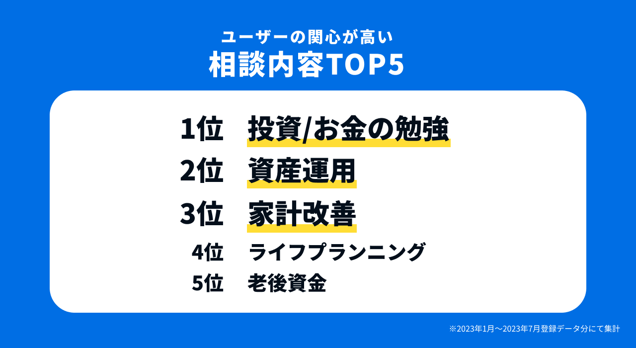 オカネコは、保険や住宅ローン、相続などあらゆるお金の相談ができるプラットフォームです。“今気になるトピック”の上位1位は「投資/お金の勉強」、次いで「資産運用」となっており、多くのユーザーが将来の備えとして投資やお金の勉強、資産運用に関心が高いことが伺えます。