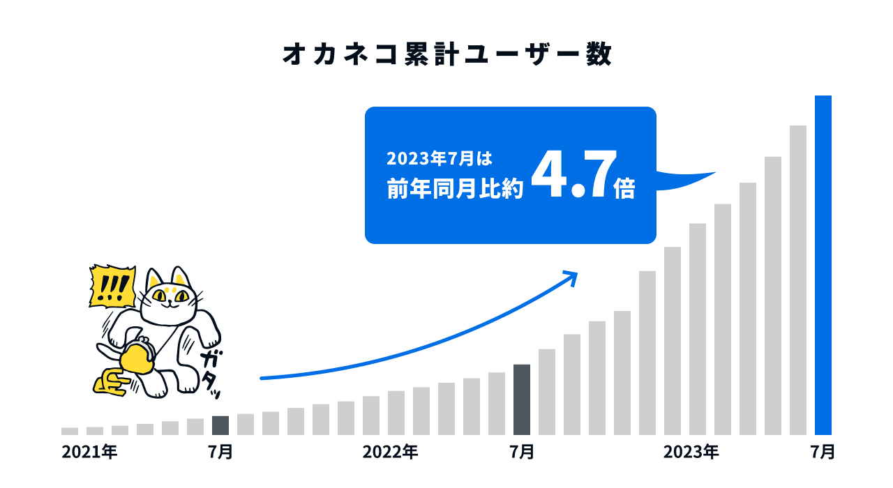 オカネコは2018年11月のリリース以降、順調にユーザー数が増加しており、2023年7月は新規登録数が単月で47,000名超となり、累計ユーザー数は前年同月比約4.7倍のスピードで成長しております。