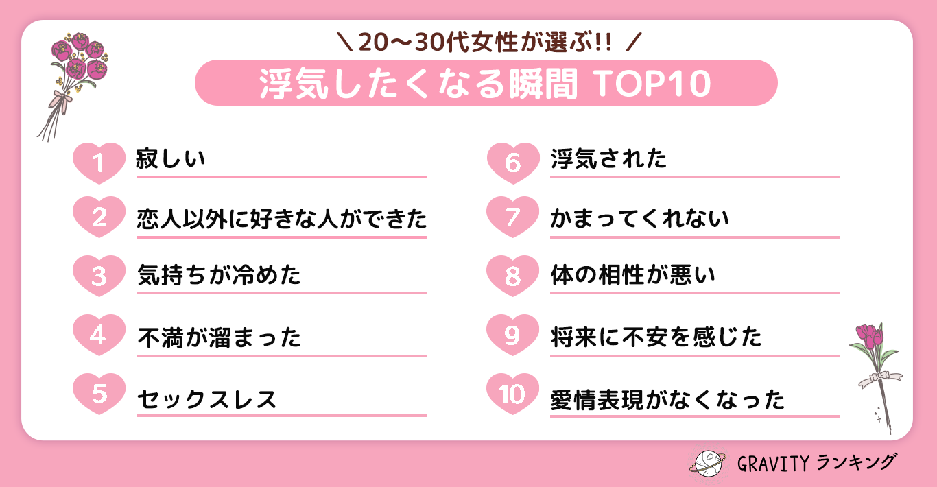 今回のテーマは、20代〜30代女性が選ぶ!!「浮気したくなる瞬間TOP10」