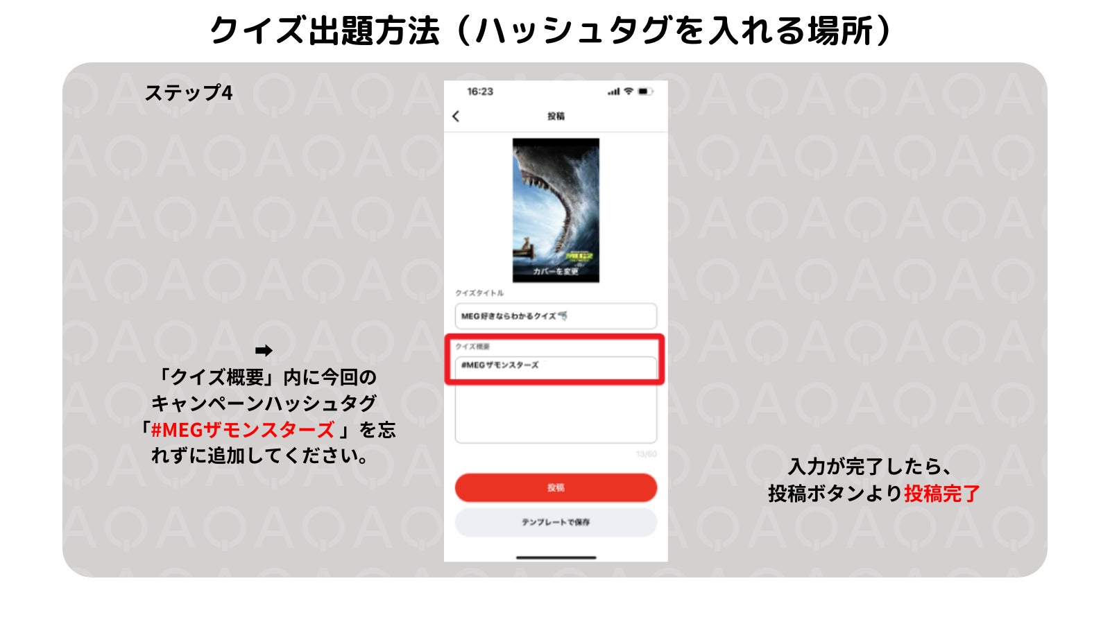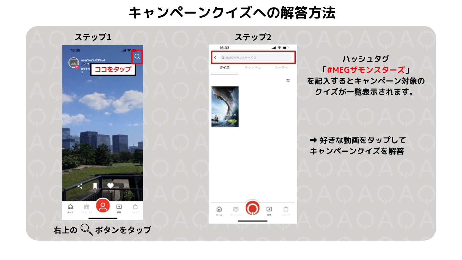応募方法:『QAQA』内でハッシュタグ「#MEGザモンスターズ」を記載し『MEG ザ・モンスターズ2』に関するクイズを投稿、または同ハッシュタグのついたクイズ問題にご解答ください