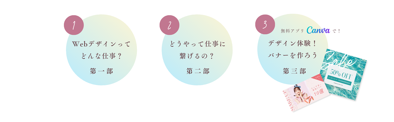 第一部:Webデザインってどんな仕事? 第二部:どうやって仕事に繋げるの? 第三部:デザイン体験!バナーを作ろう |