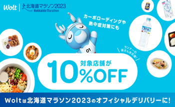デリバリーサービス「Wolt(ウォルト)」を展開するWolt Japan株式会社(本社:東京都渋谷区、代表:野地春菜、以下 Wolt)は、2023年8月27日(日)開催される「北海道マラソン2023」オフィシャルデリバリーパートナーとして歴史ある大会を応援いたします。レース当日に備える参加ランナーを応援するため、25日(金)からは会場近辺のお店からの注文を10%OFFでお届けする特別キャンペーンを実施。滞在先から外出することなくくつろぎながら、地元の人気店からのおいしいグルメはもちろん、飲み物や栄養補給のアイテムもご注文が可能です。また、レース当日にはフィニッシュ後の休息場所まで、ドリンクやフードだけではなく打ち上げ用のアルコールなどもWoltがお届けします。ランナーのみなさまにとってより良いレースとなるようデリバリーを通じてサポートいたします。