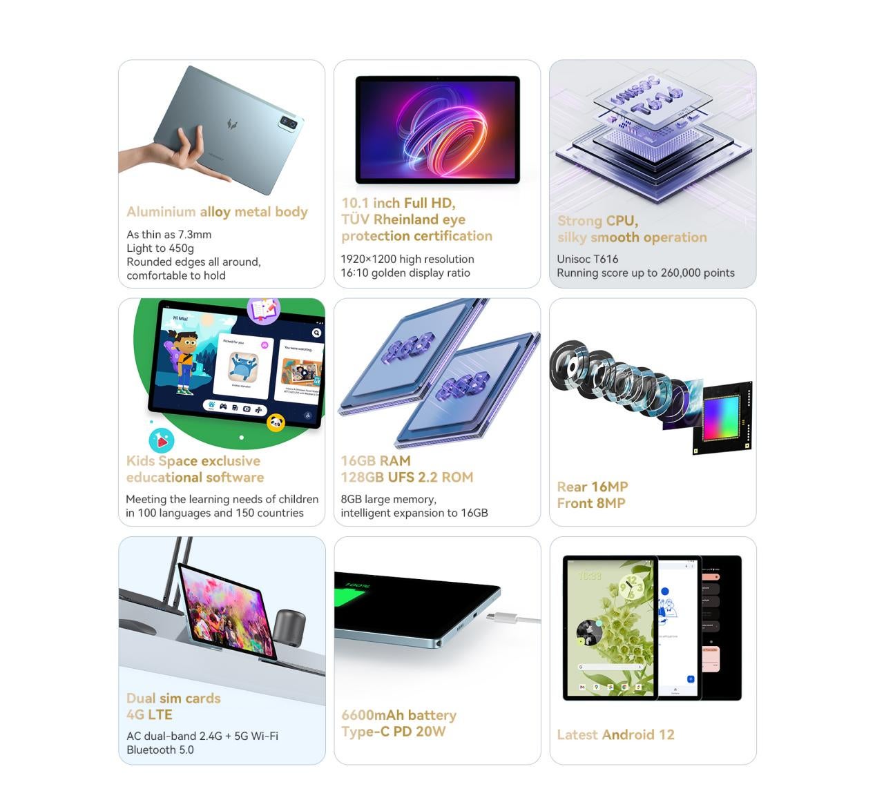 HPad1 10インチタブレットは、UNISOC T616を搭載した8コアCPUを搭載しており、2つのArm Cortex-A75ハイパフォーマンスコアと6つのCortex-A55スマートAIコアを含んでいます。スムーズなパフォーマンスを維持しながら、発熱を大幅に低減しました。Antutuベンチマークスコアは250,000を超えます。最新のAndroid 12スマートオペレーティングシステムを搭載しており、より優れた体験ができます。