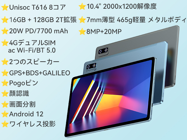 このタブレットは、2Kの高解像度IPSディスプレイを採用しており、10.4インチの画面サイズで1200×2000の解像度を持っています。新しいインサートフルフィット技術を採用し、画像の色彩と画質を完璧に表示します。800万画素のフロントカメラ+ 2000万画素のリアカメラを搭載しており、撮影や録画時に色彩と画像の鮮明さを向上させ、広範なシーンを簡単に記録できます。リアカメラにはフラッシュ機能も搭載されており、夜間の撮影やビデオ撮影がより便利で、よりリアルで美しいものになります。Headwolf HPad1 Android 10インチタブレットはワイヤレスプロジェクション機能を備えており、タブレット上のビデオや写真をテレビで表示および再生することができ、よりクリアでインパクトのある視覚体験を提供します。