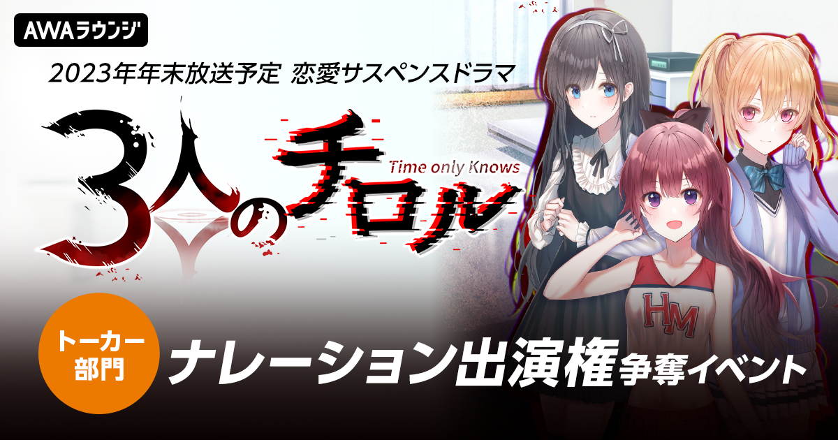 記憶喪失となったあなたの前に現れたのは、あなたの彼女『早乙チロル』を名乗る3人の同姓名美少女。3人の正体は一誰なのか?そして、彼女ら狙いは?!。世界で45万ダウンロードを記録した大ヒットインタラクティブドラマ『3人のチロル』のテレビドラマ化が決定。本イベントの優勝者には地上波で放送予定の恋愛サスペンスドラマ『3人のチロル』内でのナレーションと番組宣伝動画へのナレーション出演権が贈呈されます。その他にも、ABEMAで放映するAWAラウンジのCMにナレーション出演できる権利を進呈いたします。