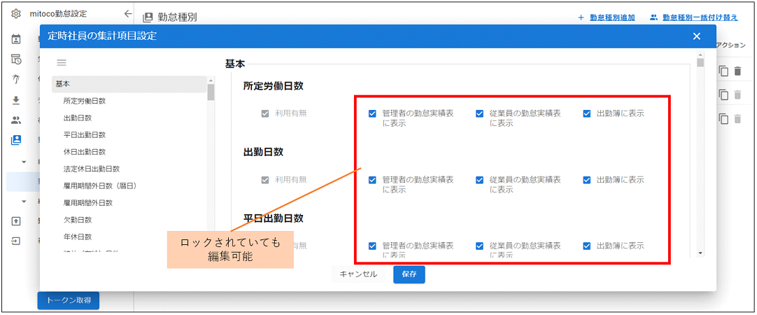 月次確定が行われてロックされた勤怠種別でも、一部項目(勤怠種別名、集計項目の勤怠種別名、出勤簿への表示有無)については変更できるようになりました。