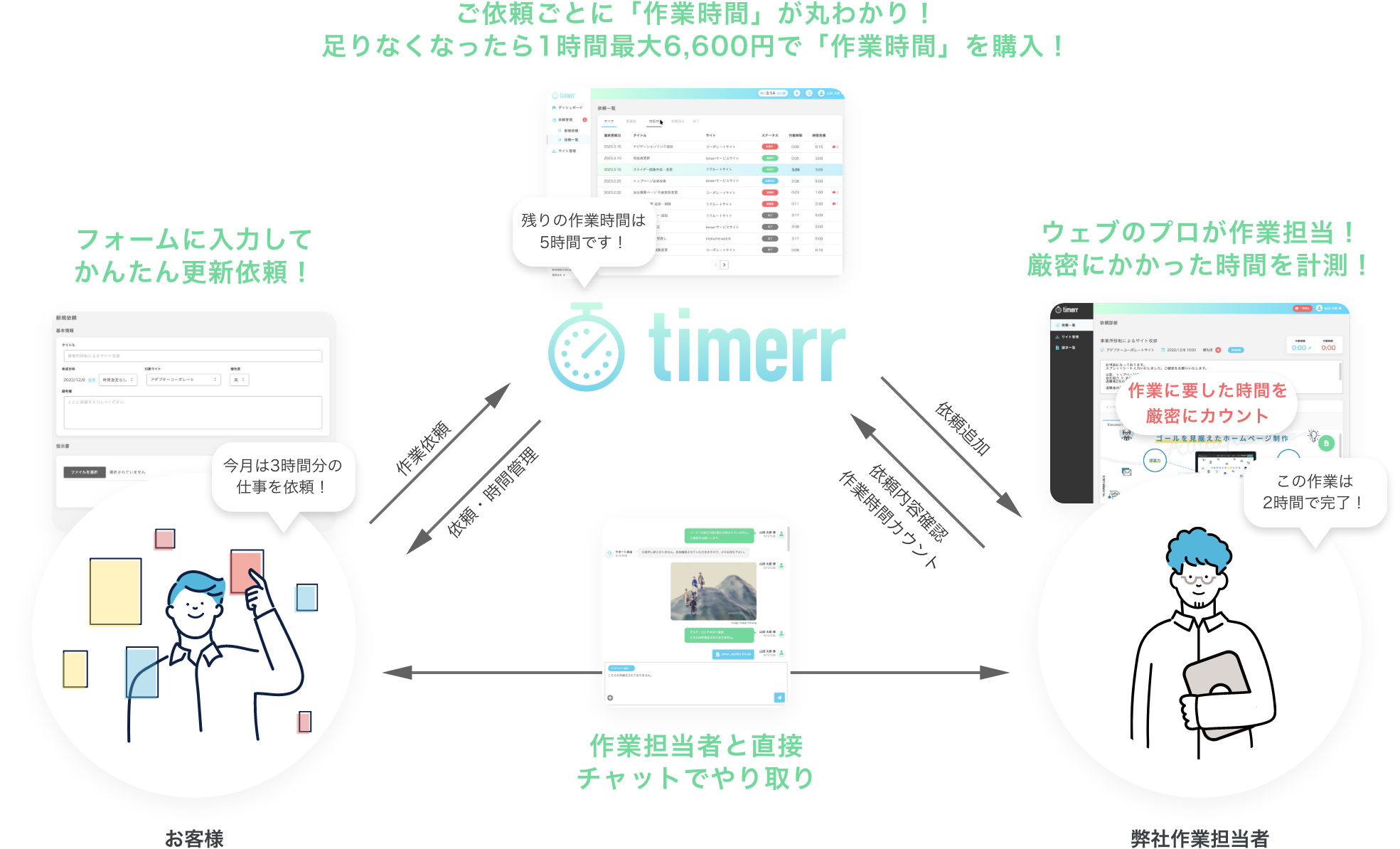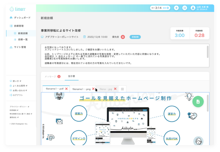 timerr(タイマー)はホームページの修正・更新作業やデザイン業務を、担当者の「時間」を使って、ウェブ上で簡単に依頼できるサービスです。