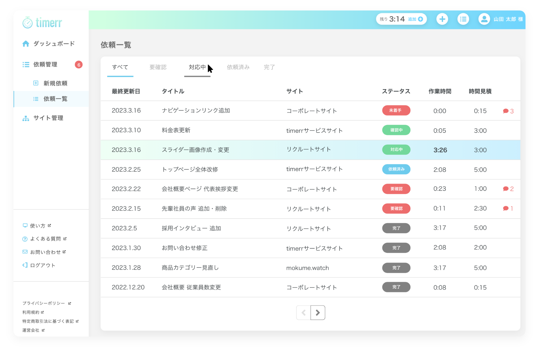 作業中・依頼確認中、メッセージやり取り中は自動的に担当者のタイマーがスタート・ストップするので厳密な時間計測が可能です。