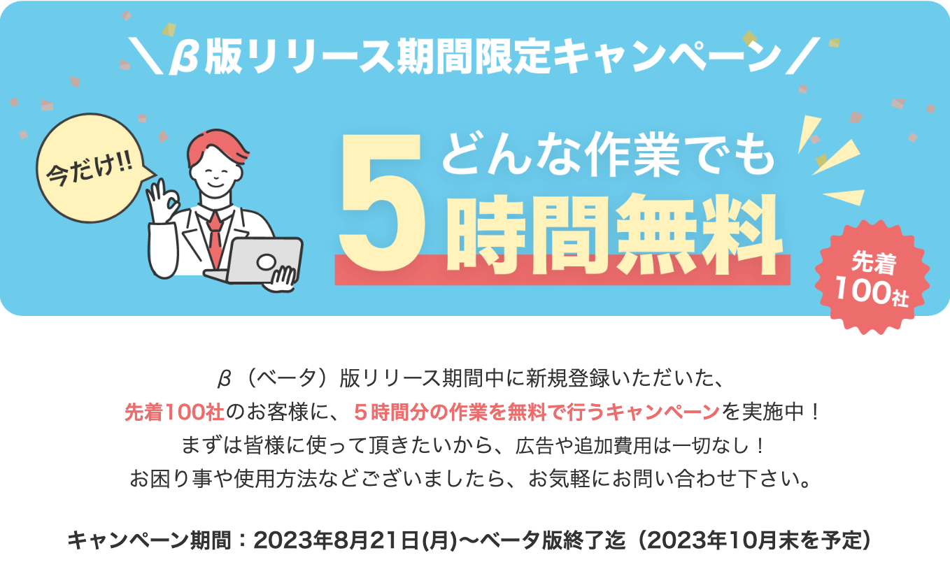 β版リリースに伴い、今ならどんな作業でも「5時間分無料でお試しいただけるキャンペーン」を実施中!
