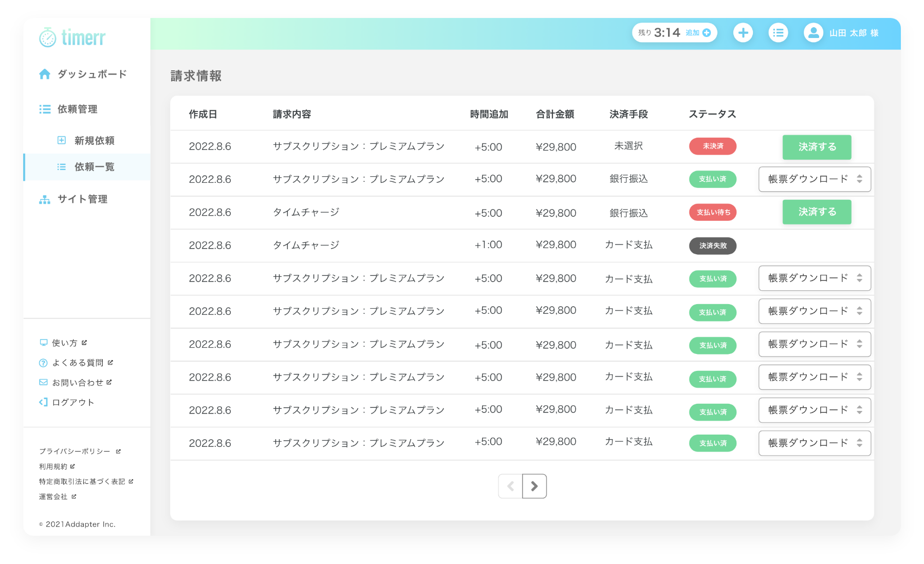 過去のお支払いについては全て、帳票(請求書)のダウンロードが可能です。再発行も管理画面から行えますので経理の手間を減らせます。