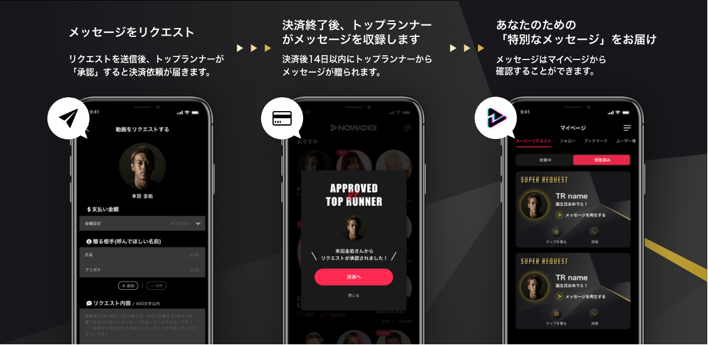 応援メッセージや悩み相談、誕生日・結婚祝いなどを、好きなトップランナーに依頼し、世界に1つだけのオリジナルメッセージをNowVoiceアプリで受け取ることができます。