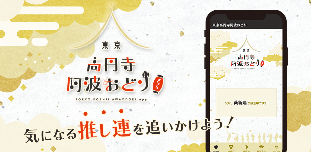 「東京高円寺阿波おどり」アプリ(iOS/Android)は、阿波おどりの連(踊りのグループ)が、今、どの演舞場で踊っているのかを追跡できます。お目当ての連がどこにいるのか、また、目の前で踊っているかっこいい連がどの連なのかをチェックしたりして、東京高円寺阿波おどりをもっともっと楽しむためのアプリです。