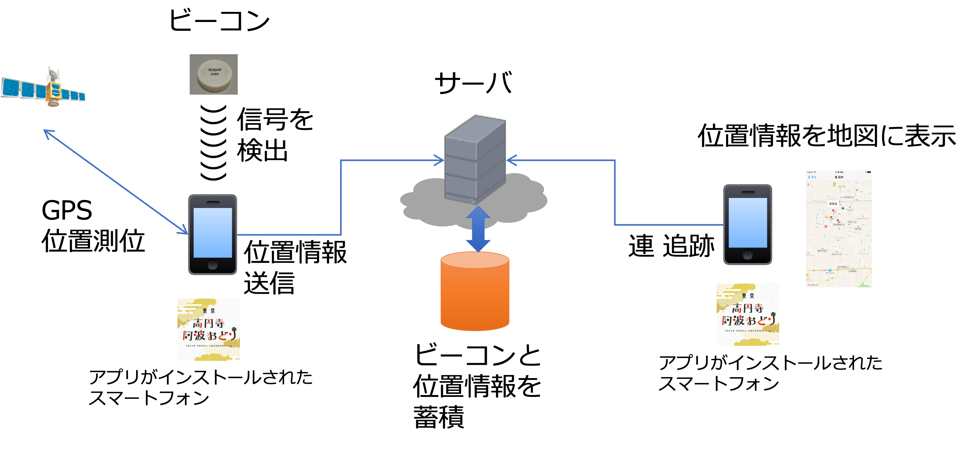 「東京高円寺阿波おどり」アプリは、BLEビーコン(iBeacon)とスマートフォンのGPSを使って連追跡機能を実現しています。