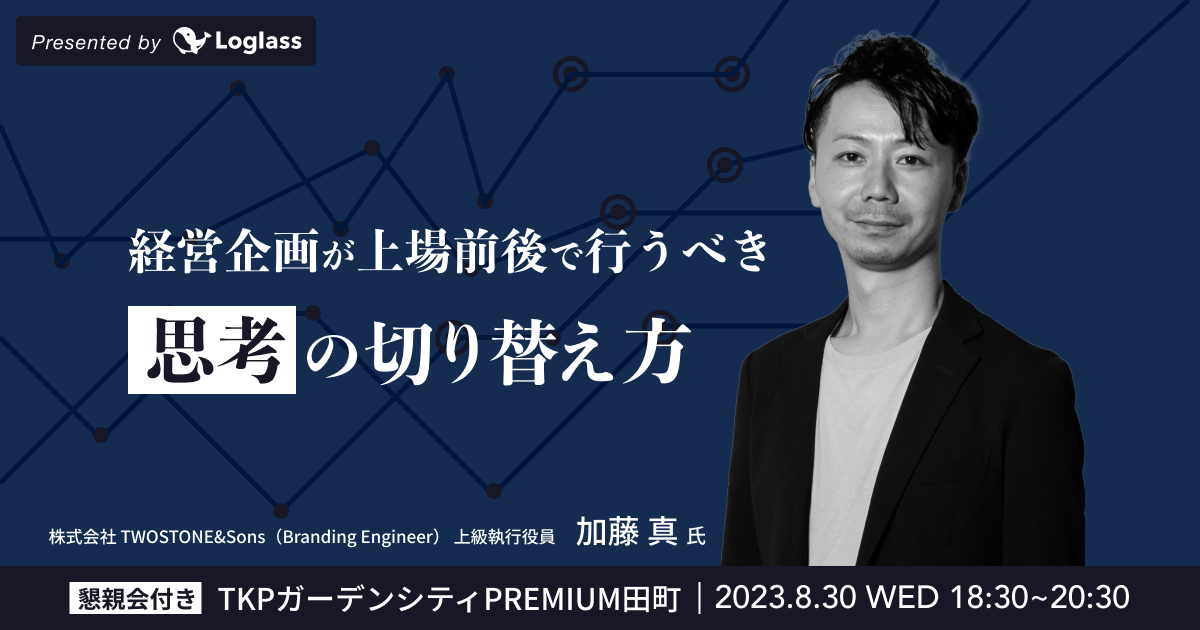 本セミナーでは、経営戦略本部を管掌する上級執行役員加藤真より、TWOSTONE&Sonsの経営企画室がIPO前後でどのように「思考」を切り替えてきたか、またどのように経営の意思決定をサポートしたかを解説いたします。M&Aやホールディングス体制への移行など、上場後様々な戦略的経営判断が下され、急成長過程にある会社を支える部門のリアルな実務をお話させていただきます。