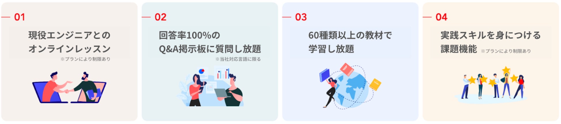 現役エンジニアとのマンツーマンオンラインレッスンで直接悩みを相談できる他、60種類以上の豊富で実践的な課題機能付きの「教材」に加え、つまずいたらいつでも現役エンジニアに相談できる「Q&A掲示板」も完備されています。
