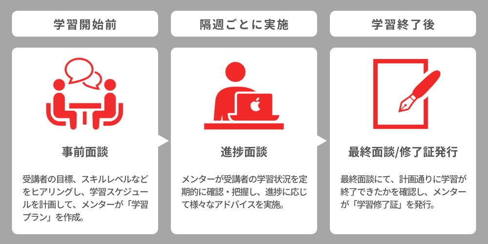 受講者は、隔週で実施される「進捗面談」を受けることができます。メンターが受講者の学習状況を定期的に確認・把握することで、進捗に応じた様々なアドバイスをします。