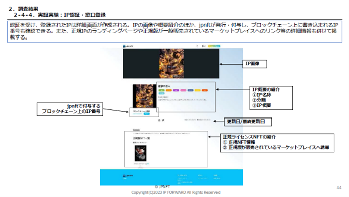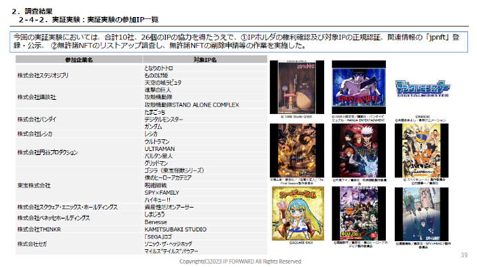 IP FORWARD株式会社は、経済産業省委託事業「令和4年度コンテンツ海外展開促進事業(NFTマーケットプレイスにおける正規版コンテンツ流通促進に係る調査事業)」を受託し、IPホルダの皆様、関係事業者の皆様にご協力いただき、株式会社JPNFTと共に、本プロジェクトを進めてまいりました。