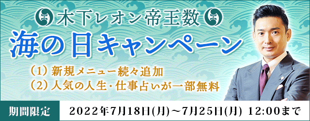 フジテレビ系列で放送中の占い番組『突然ですが占ってもいいですか?』で人気を博している木下レオン。ただいま、月額公式サイト『木下レオン◆帝王数』にて、『木下レオン帝王数 海の日キャンペーン』を公開中です。期間中、新規占いメニューが続々追加されるほか、サイト内で人気の人生・仕事占いが一部無料でお試し鑑定が可能となっております。ぜひこの機会にご利用ください。
