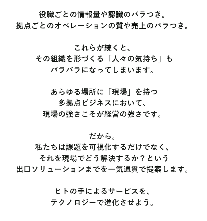 多店舗・多拠点ビジネスのバラつきの原因となる経営課題の可視化から、改善ステップの設計、実行、効果のモニタリングまでを一気通貫で支援します。