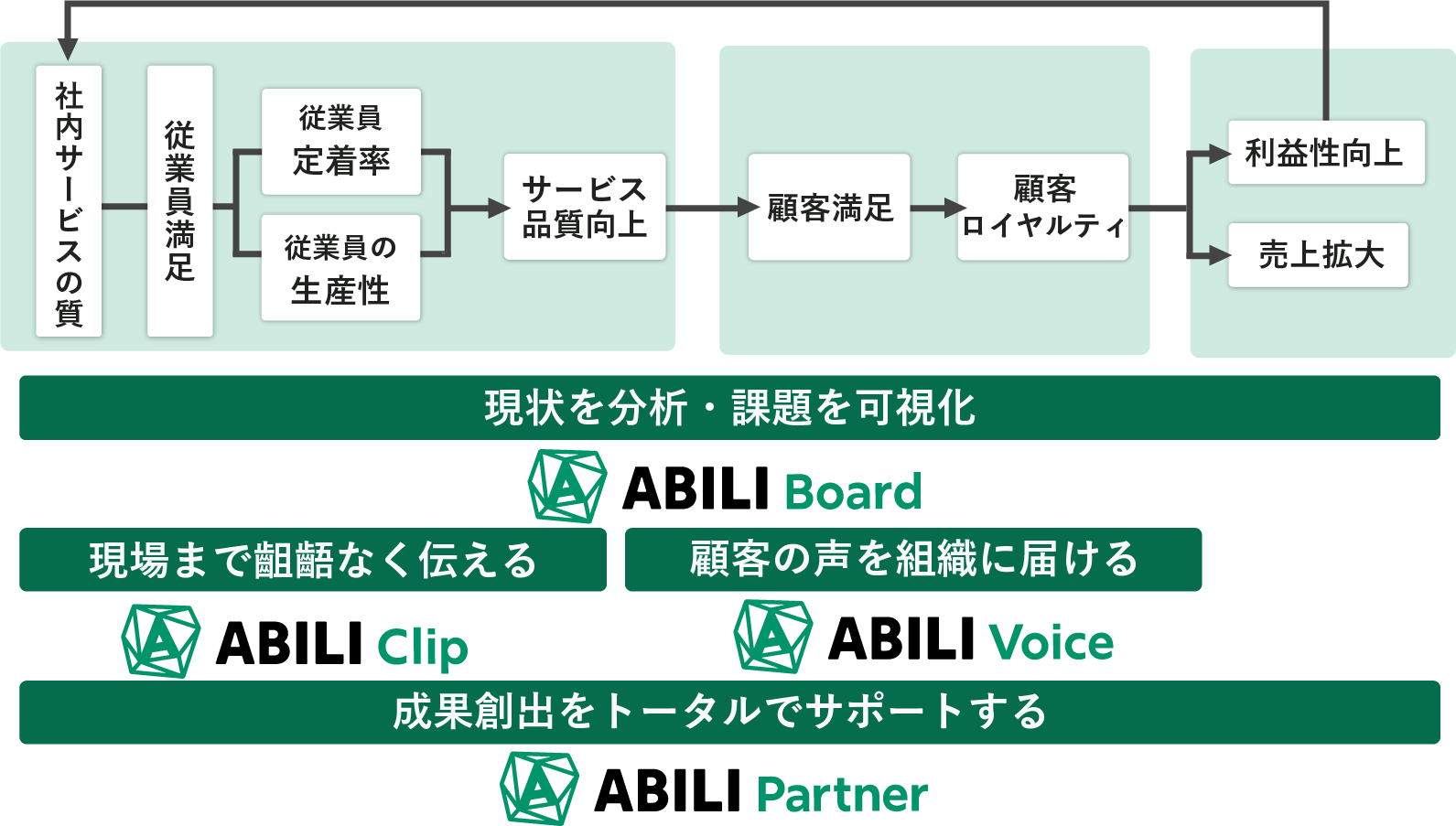 ABILIはハーバード大学教授ヘスケット氏とサッサー氏らがしたサービス業の持続的成長のフレームワークとされれる「サービス・プロフィット・チェーン(以下、SPC)」に沿った価値提供を行います。企業の長期利益は従業員満足(ES)、顧客満足(CS)が基となり、ロイヤルカスタマーを生み出すことで持続的成長につながることが知られています。