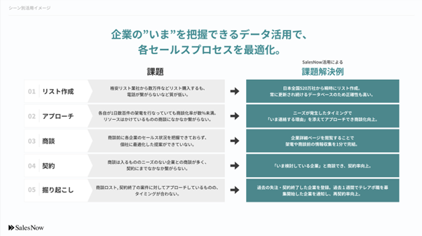 日本全国500万社以上の企業データを基盤に営業の効率化を支援する「SalesNow」と組み合わせることで、受注角度の高い企業を抽出したり、セールス業務を自動化したりと営業効率を最大化することを目指していくことができます。