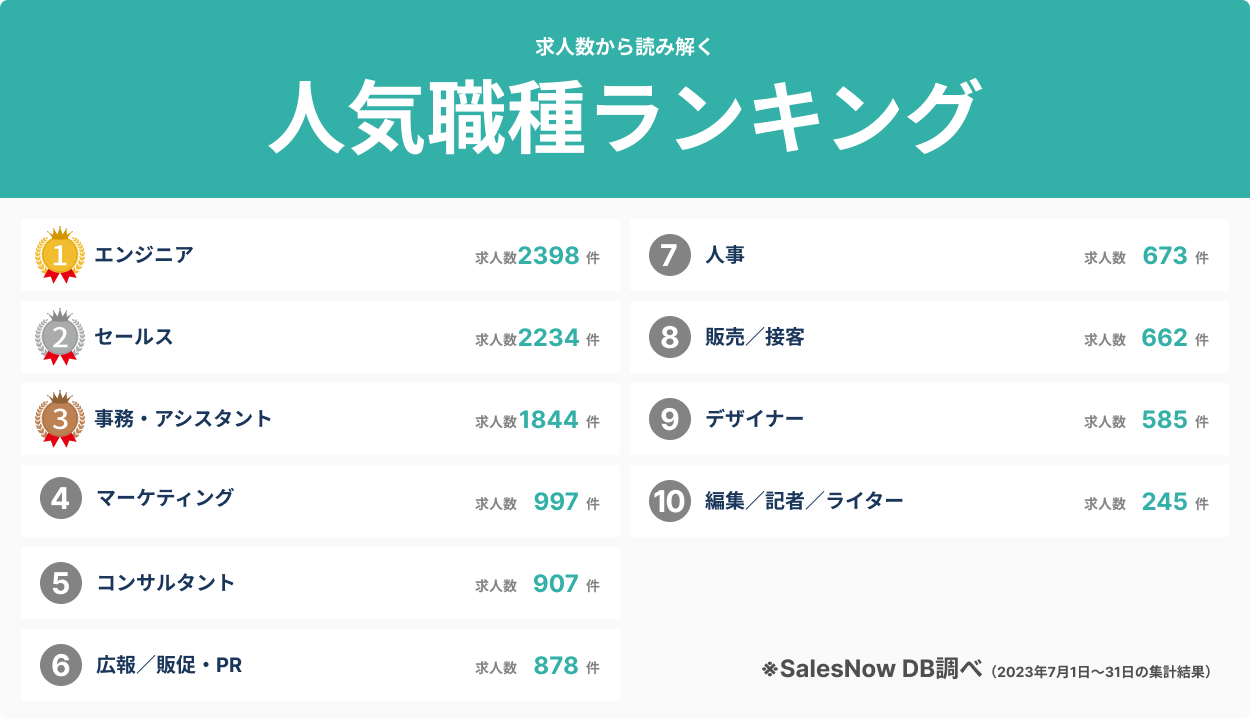 日本最大級のデータベースを誇る「SalesNow DB」において、2023年7月1日から7月31日までの間に掲載された求人数を読み解き、求人数の多い職種ごとに調査しました。