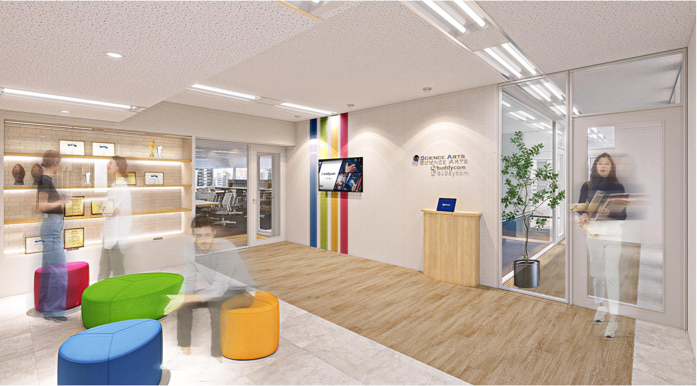 壁やソファなどにBuddycomカラーの4色を取り入れ、POPで親しみやすい印象でお客様をお出迎えします。