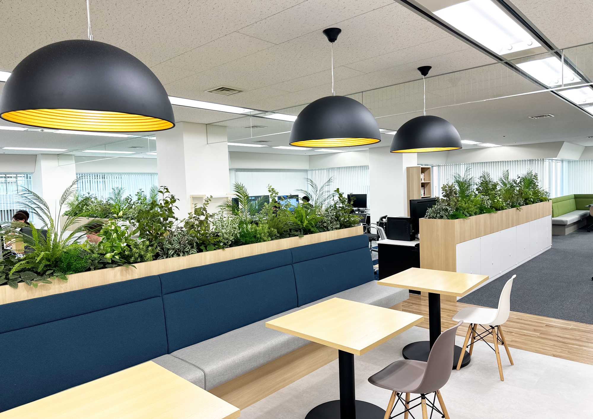 ・オフィス内の各所に、BOX席やハイテーブル、ソファ等を設置しました。これによりミーティングや個人での作業を状況に応じて柔軟に行うことができ、コミュニケーションの活性化や作業効率化が実現します。