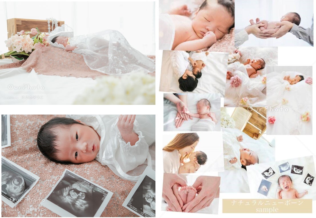 ナチュラルニューボーンフォトは、赤ちゃんの自然な表情や仕草、赤ちゃんと一緒に過ごすお母さんやお父さんとの笑顔あふれる家族の瞬間を撮影します。赤ちゃんが眠っている姿や泣いている表情、笑顔の瞬間など、新生児ならではの可愛らしい姿を自然に残すことができます。