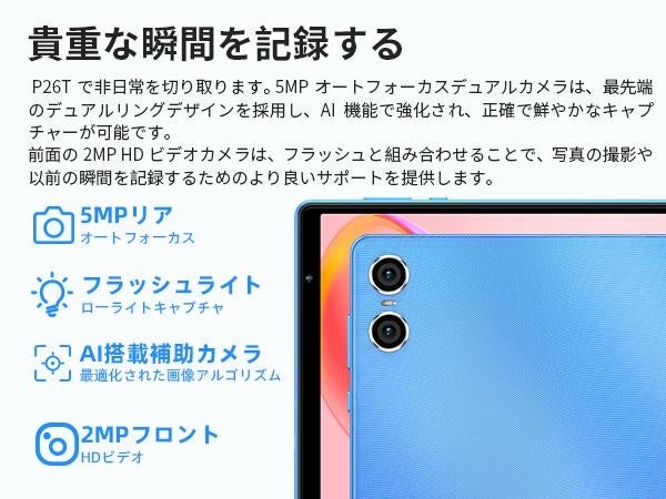 5MPオートフォーカスデュアルカメラは、最先端のデュアルリングデザインを採用し、AI機能で強化され、正確で鮮やかなキャプチャーが可能です。前面の2MP HDビデオカメラは、フラッシュと組み合わせることで、写真の撮影や以前の瞬間を記録するためのより良いサポートを提供します。フロントカメラは顔認証によるロック解除に対応しています。設定で顔情報を安全に登録し、顔をサッとスキャンするだけで、パスワード情報の入力に煩わされることなく、簡単にタブレットシステムにアクセスできます。