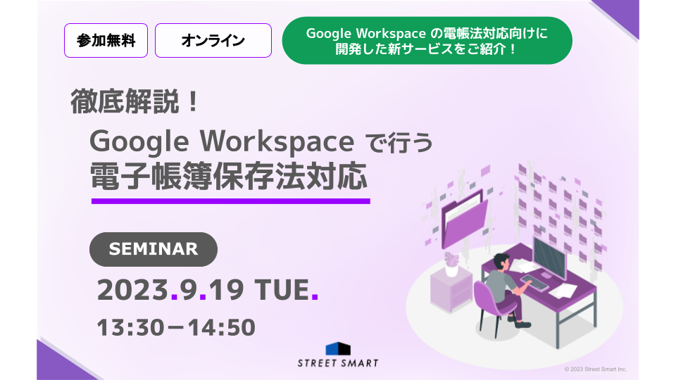 本セミナーでは、改正された電帳法の対応期限が差し迫る中、Google Workspace による電帳法対応のマニュアル作成に協力したストリートスマートが、対応すべき重要ポイントを改めて解説します。また、Google Workspace で電帳法対応を検討する企業のニーズを基に開発した、Google Workspace と連携する新サービスを、初めてご紹介します。