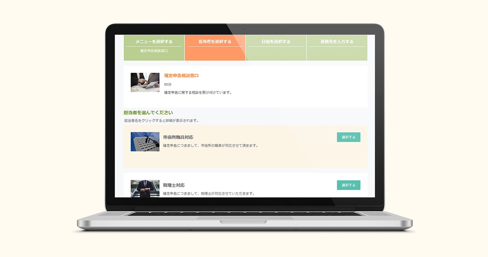 Zoomを使った「初めての確定申告」、「申請書類の確認」などオンライン相談会の作成・予約管理が可能です。