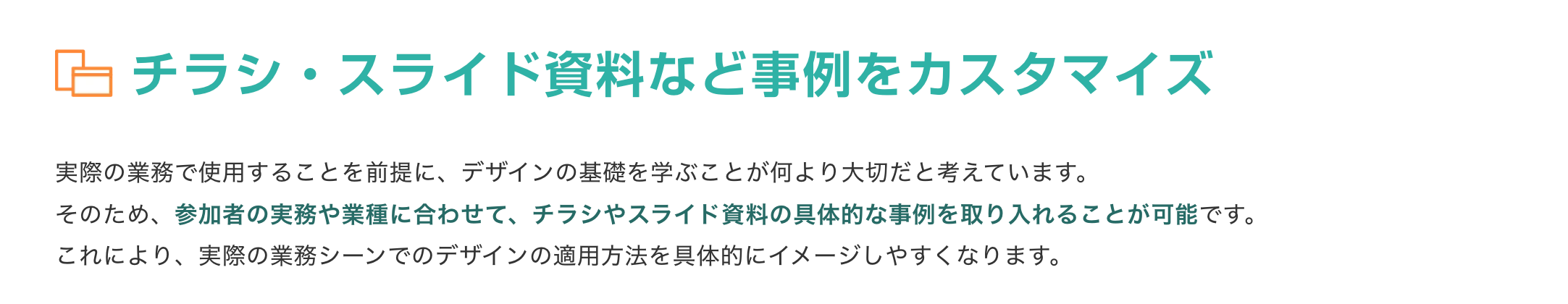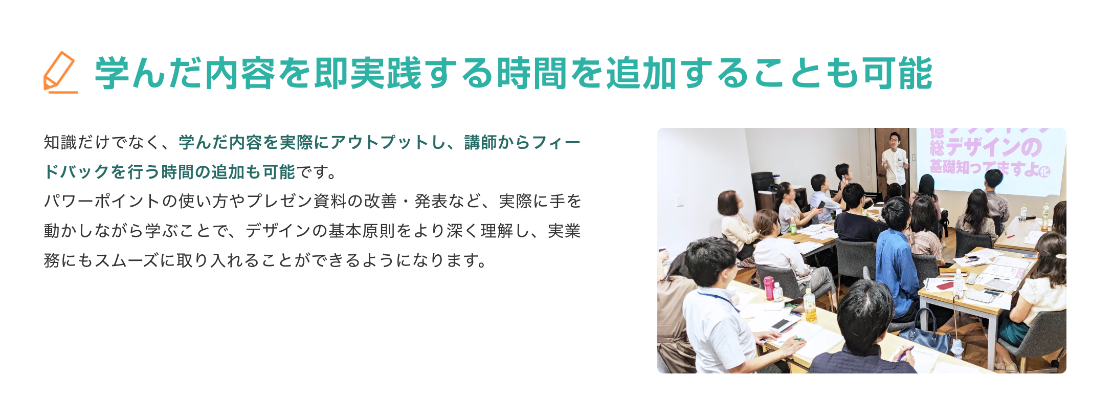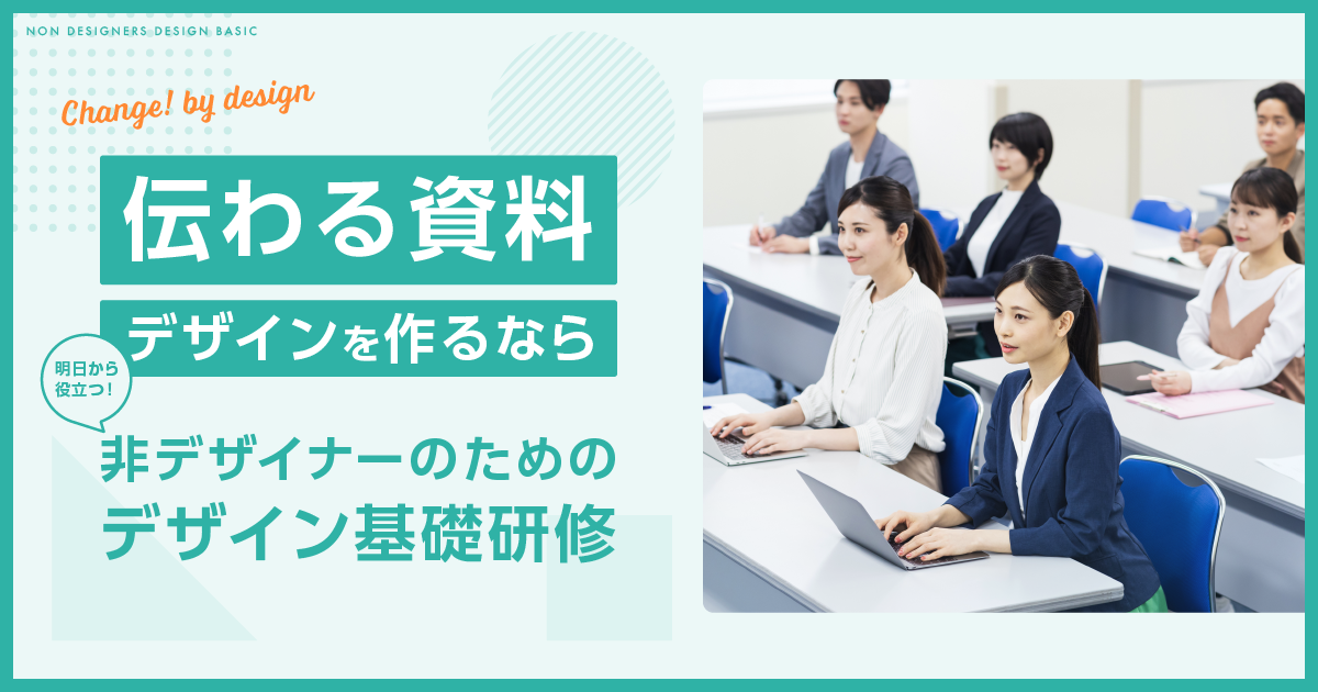 デザインを学ぶのが初めての方(非デザイナー)でも、明日から役立つデザインの基礎知識を学び、ビジネスに活かすことを目的とした企業向け社内研修です。