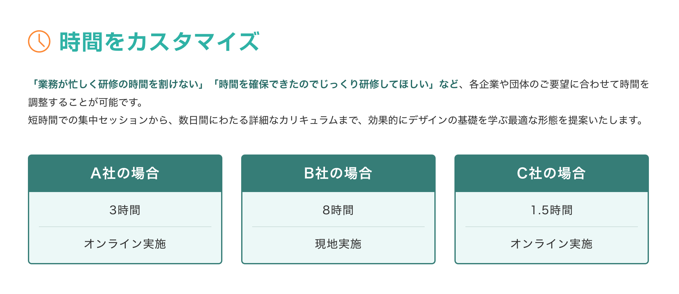 お客様のご要望に合わせて時間や事例、プログラムなどカスタマイズすることができます。