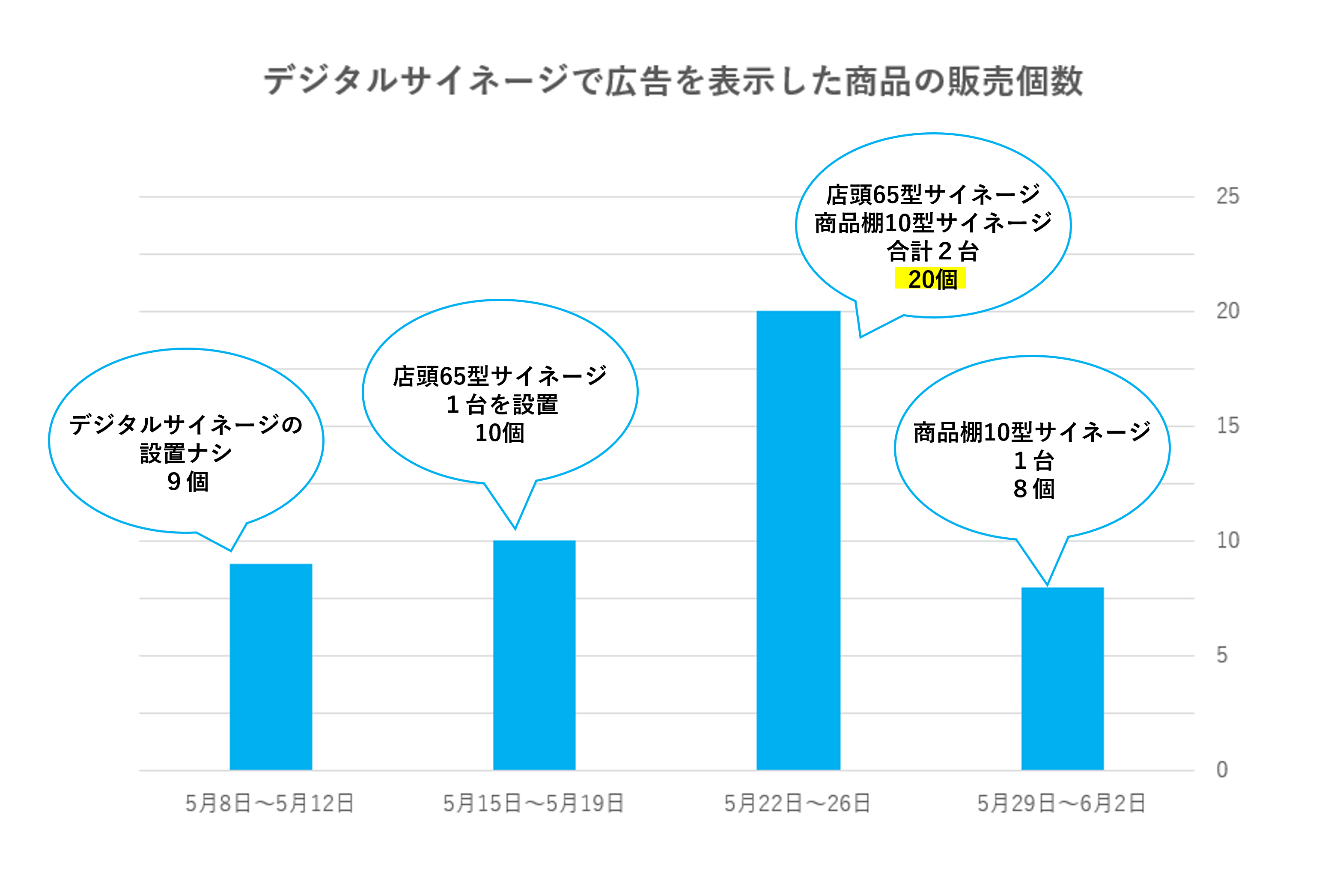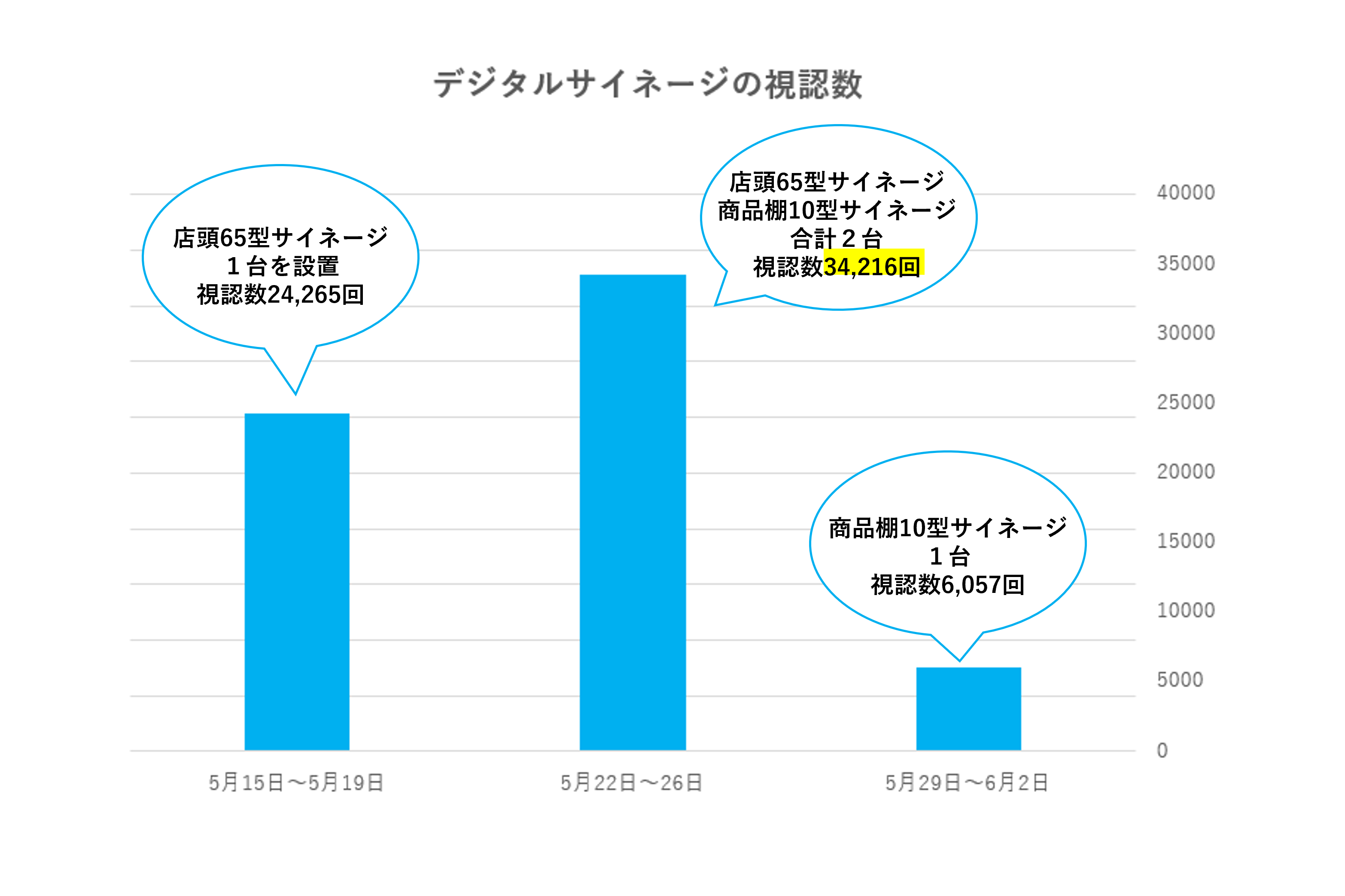 1台、店内商品棚へ1台、合計2台設置した週の売上が最も販売個数が多いという結果を得ることができました。またAI解析カメラで測定した視認数においても、2台設置の週が最も多い結果となりました。
