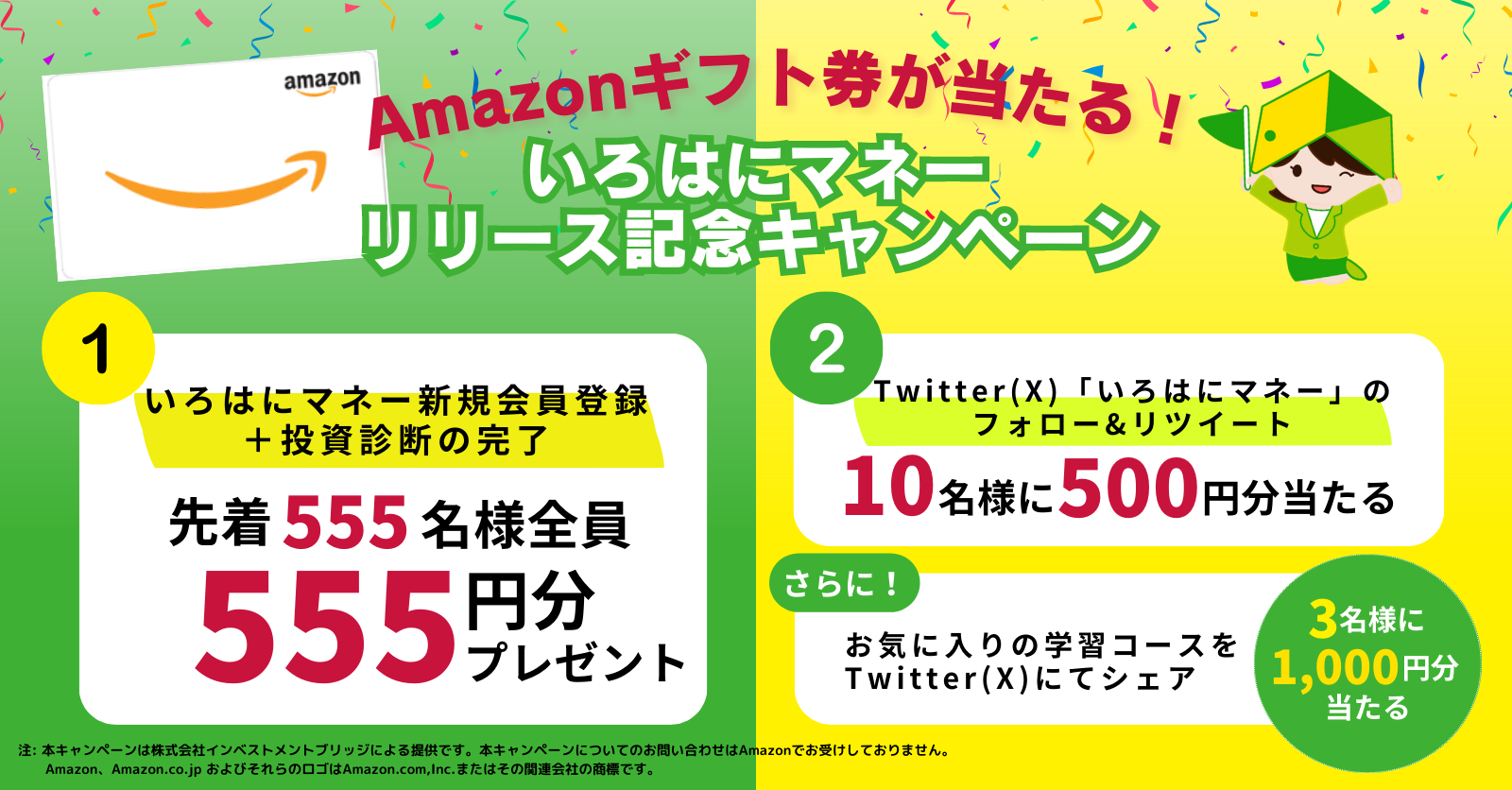 期間中に「いろはにマネー」新規会員登録+投資診断の完了で、先着555名様にAmazonギフト券555円分をプレゼント! -