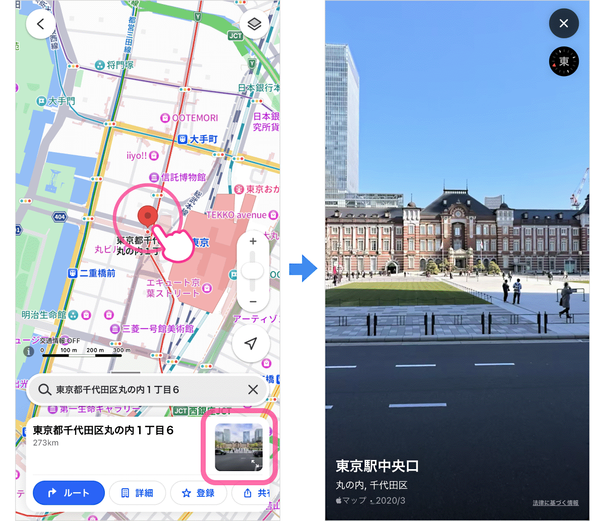 ・徒歩、自転車、車のルート検索結果の画面左上に表示される写真をタップすると「Look Around」機能画面が起動します。以降の使い方は〈地図上で任意の地点を確認する場合〉と同様です。