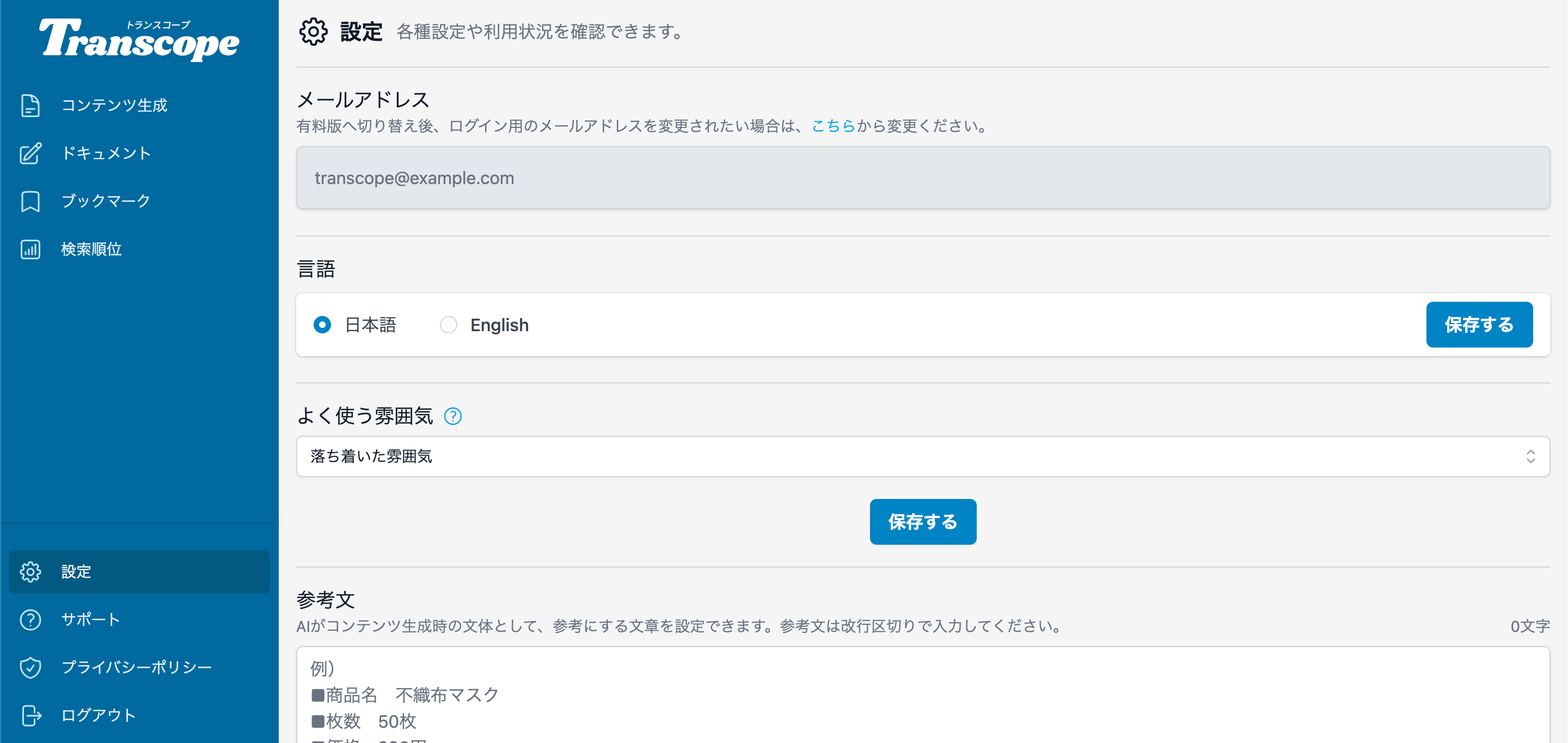 Transcopeの[設定]メニューをクリックして設定画面にアクセスしてください。
