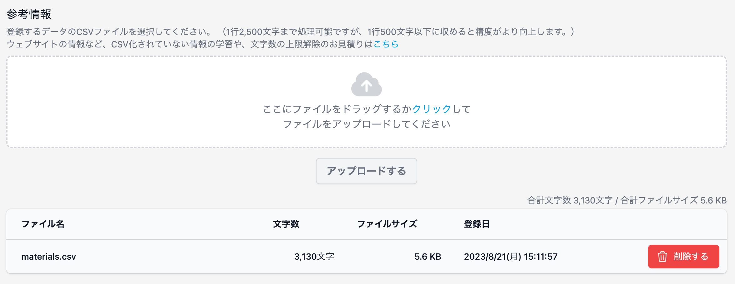 アップロードが完了すると、アップロード済みのCSVの一覧が表示されます。