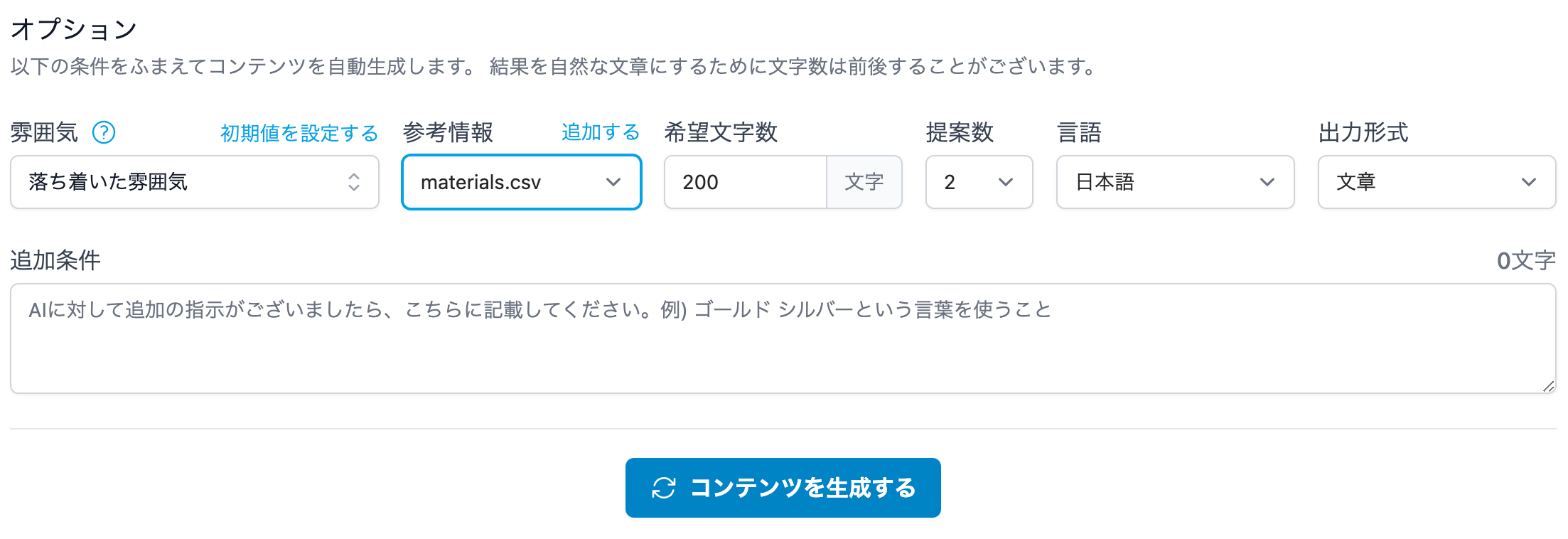 アップロードした資料は、[コンテンツ生成]メニューの[参考情報]から選択することで、コンテンツ生成に反映させることができます。