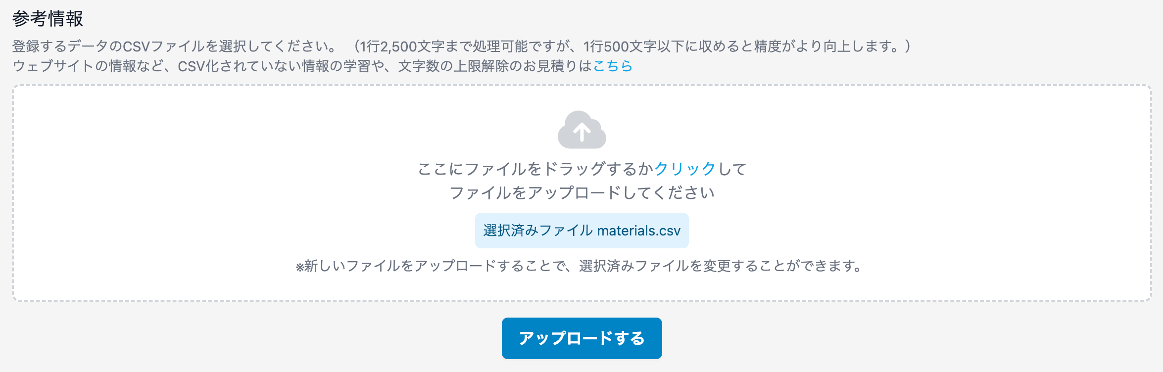 [参考情報]からファイルをアップロードし、[アップロードする]ボタンをクリックしてください。