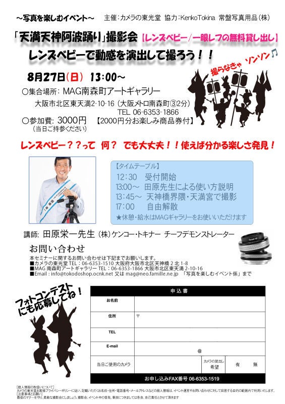 株式会社ケンコー・トキナー(本社:東京都中野区、代表取締役社長:山中 徹)は、写真用品の知識の普及を目指し、各地カメラ店へ講師の派遣を行っています。8月27日(日)に大阪市・南森町「カメラの東光堂」主催にて、「「天満天神阿波踊り」撮影会(レンズベビーで動感を演出して撮ろう!)撮影会イベントを行います。参加費は3,000円、事前予約が必要です。
