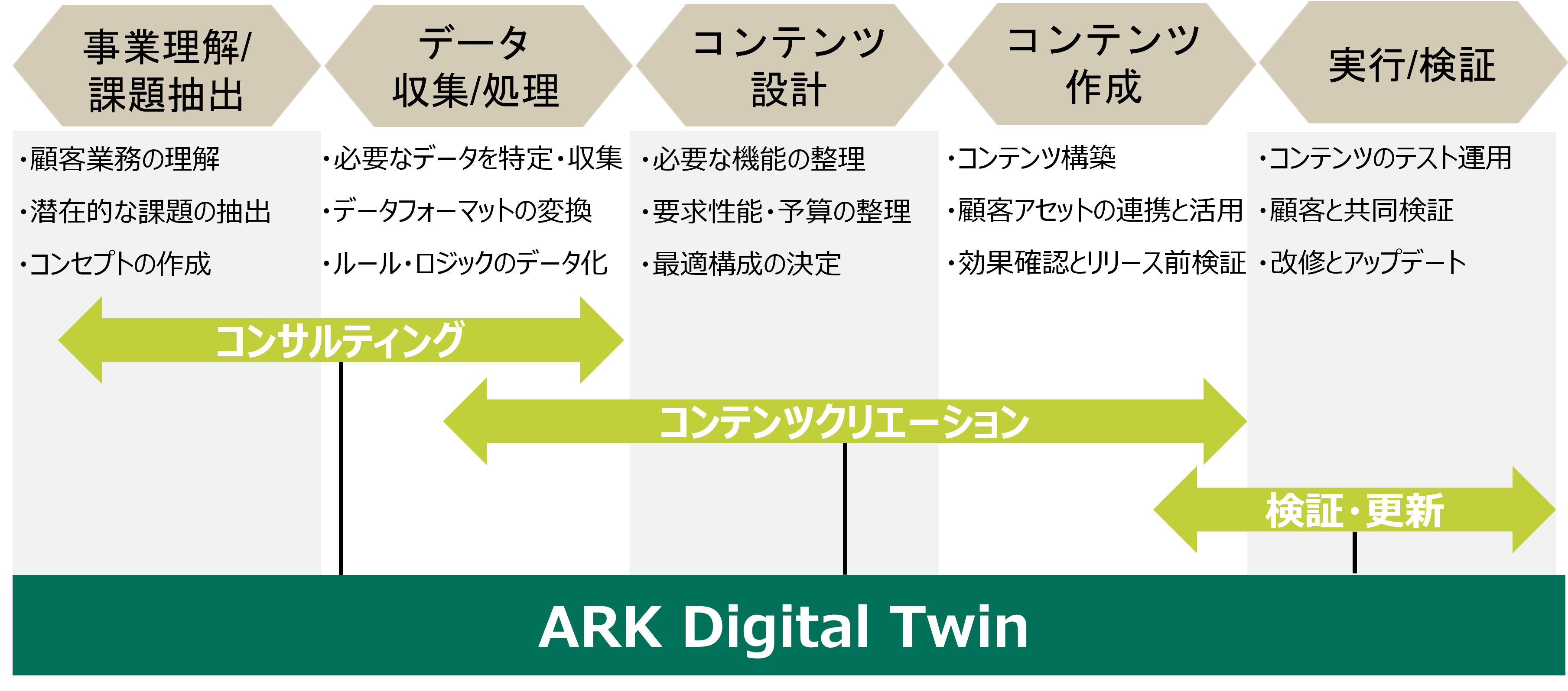 ARKデジタルツインプラットフォームは、課題発見からコンテンツ作成までの工程を対応していることから、要望に合わせたソリューションを提供できます。