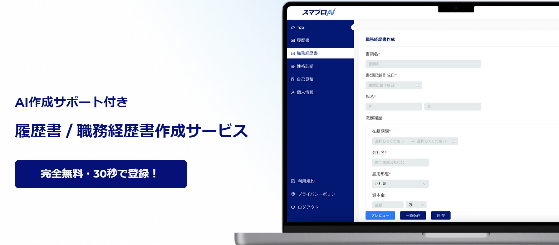 スマプロAIは完全無料、広告なしの履歴書、職務経歴書web作成サービス。転職支援やキャリアコーチング支援で培ったノウハウをつぎ込んだAIサポートで受かる面接書類を簡単作成。さらにMBTI性格分析による適職診断や年収査定機能で自己分析にも役立ちます。