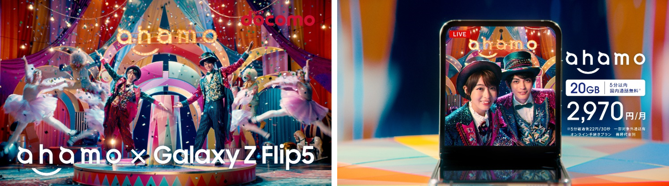 TVCMでは、ahamo×Galaxy Z Flip5のカラフルかつファンタジーな世界観をサーカスショーで表現しています。森さんと神尾さんが煌びやかな衣装で登場し、カラフルな空間で新商品「Galaxy Z Flip5」の機能やahamoのスペックについて楽しく披露します。また、サーカスにちなんで森さん、神尾さんが実際に大道芸をしながら、ハンズフリーの大道芸セルフィーに挑戦する様子にもご注目ください。