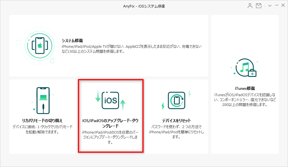 2>AnyFixを起動してから、iPhoneをUSBケーブルで接続して、「iOS/iPadOSをダウングレード・アップグレード」機能を選択します。