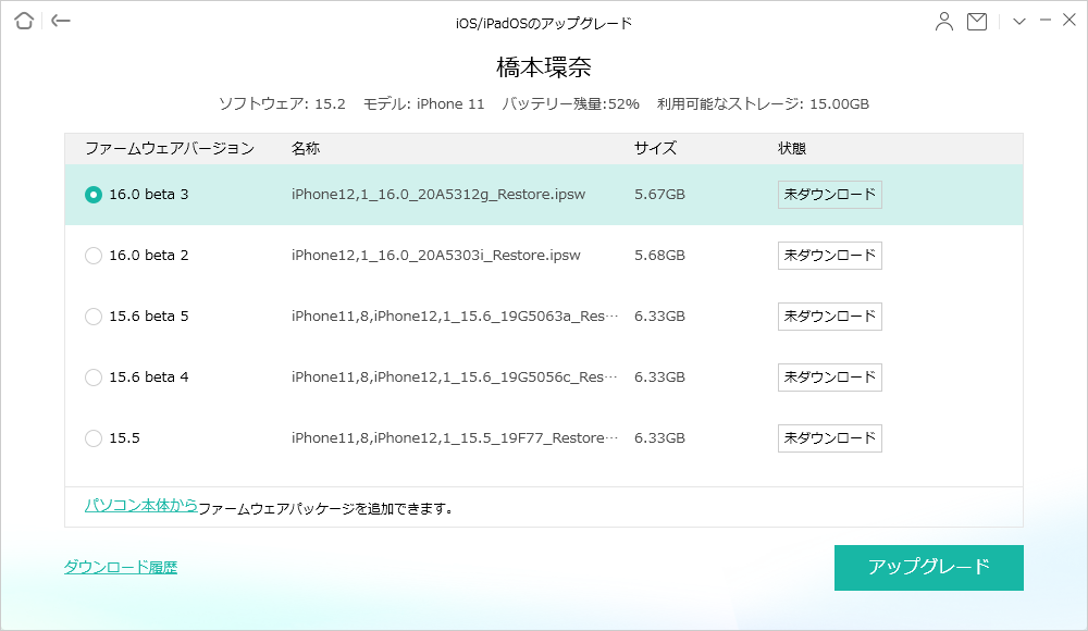 4>iOS 16 beta版を選択して、「ダウンロー」をクリックします。