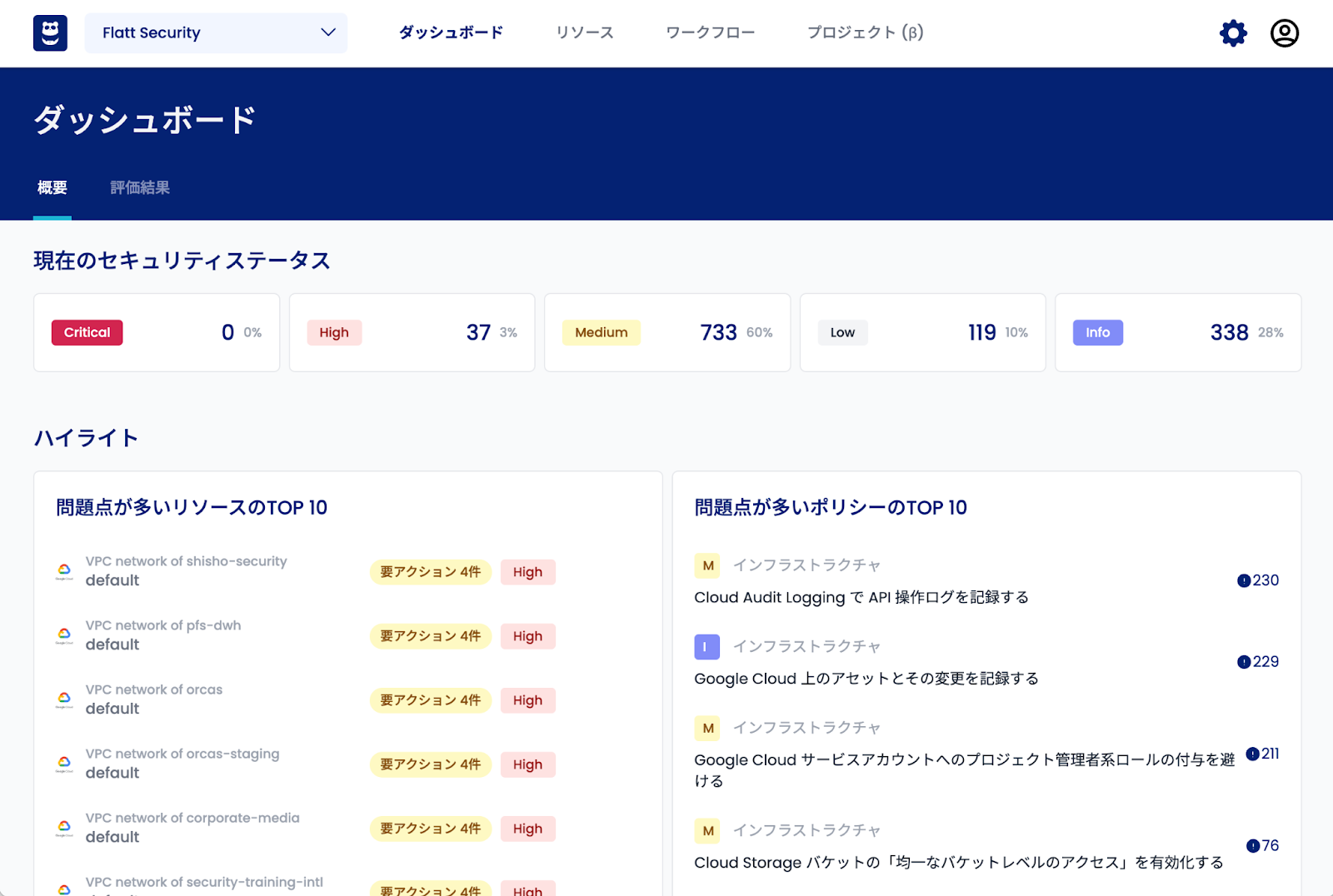 シンプルで直感的に操作しやすいUIを採用しているため、見たい情報が一目でわかります。ダッシュボードでは、検出されたリスクへの対応状況や、検出結果のハイライトなどを確認することが可能です。